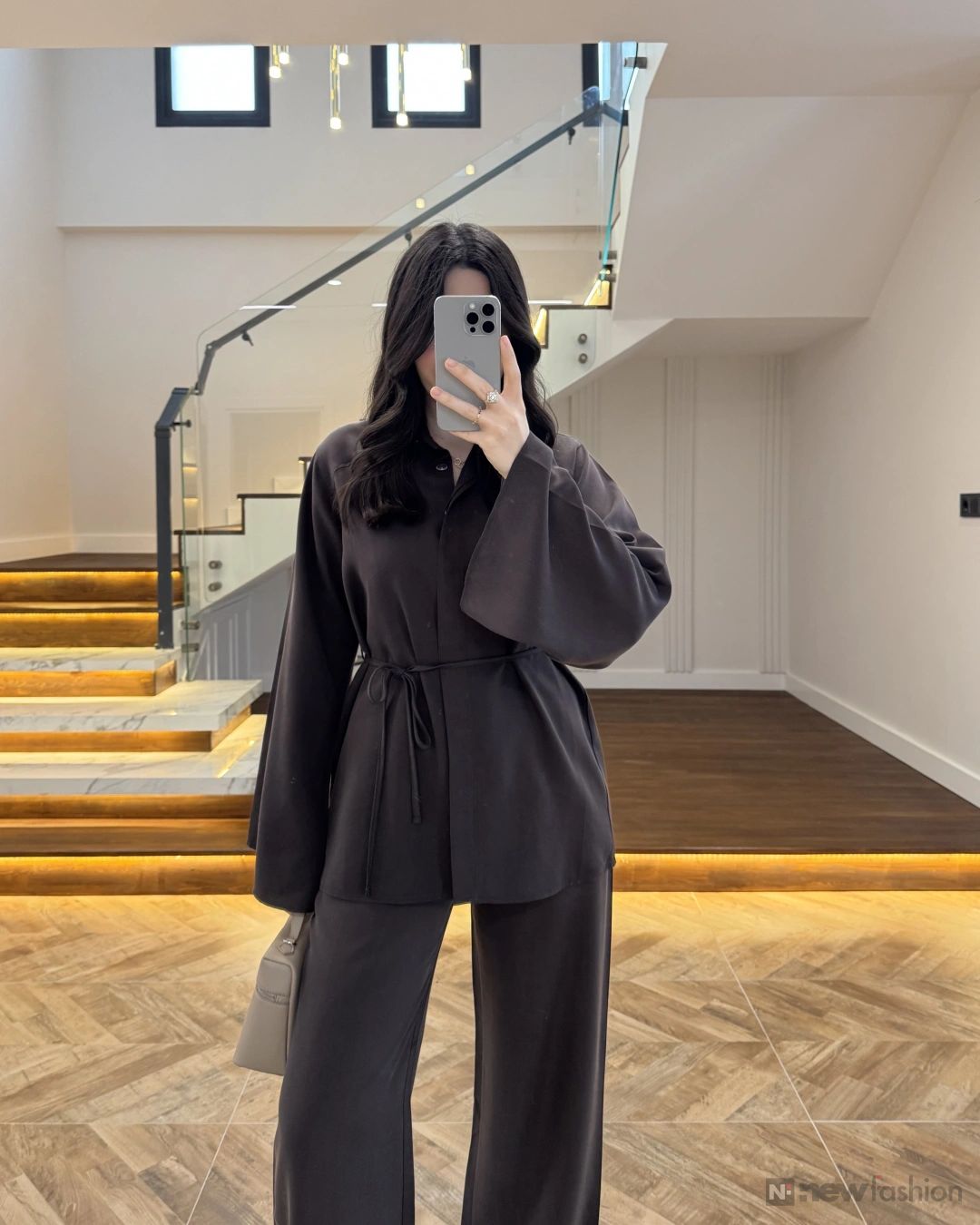 أنسومبل نسائي راقٍ من قطعتين مع حزام للخصر وأكمام واسعة لإطلالة محتشمة وعصرية